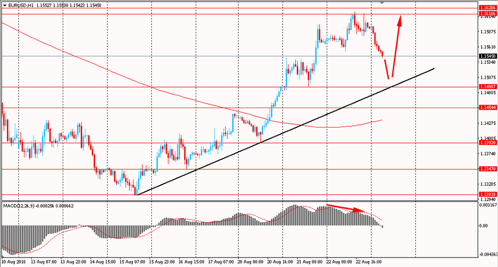 Пара EUR/USD сегодня утром упала к $1.1555, отступив от вчерашнего максимума. В среду пара в очередной раз выросла и закрыла уже шестой день подряд на положительной территории. Однако, уже сегодня, усиленная образованием медвежьей дивергенции на часовом графике по индикатору MACD, пара начала падать и стремится к линии поддержки от 15 августа. В любом случае стоит помнить, что единая валюта по-прежнему находится выше линии скользящей средней MA 200 H1 и выше наклонной поддержки тренда последних 6-ти дней. В данной ситуации наиболее уместным будет дождаться окончания коррекции и, в случае сохранения бычьего потенциала, присматриваться к новым покупкам.