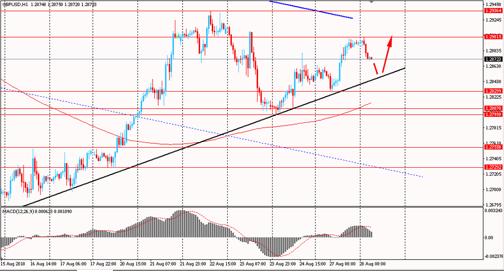 Пара GBP/USD сегодня утром немного снизилась к $1.2870, отступив от вчерашних максимумов. В понедельник пара, оттолкнувшись от линии поддержки глобального восходящего тренда, выросла и закрыла день на положительной территории. На текущий момент британец немного корректируется, но все еще находится выше линии скользящей средней MA 200 H1 и линии поддержки от 15 августа. В данной ситуации наиболее уместным будет присматриваться к новым покупкам пары на окончание коррекции.