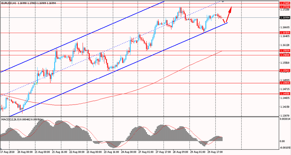 Пара EUR/USD сегодня утром торговалась в диапазоне $1.1695-10, оставаясь около недельных максимумов. В среду пара, оттолкнувшись от линии поддержки общего восходящего канала, выросла и закрыла день на положительной территории. На текущий момент единая валюта по-прежнему находится выше линии скользящей средней MA 200 H1 и торгуется в восходящем тренде от 15 августа. В данной ситуации наиболее уместным будет присматриваться к новым покупкам пары на коррекциях.
