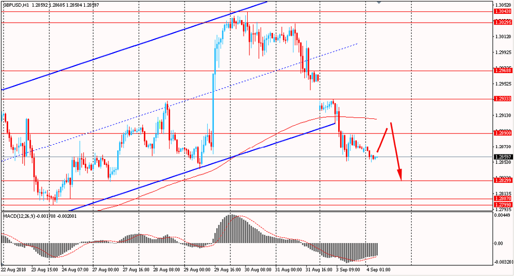 Пара GBP/USD сегодня утром упала к $1.2855, продолжая снижение понедельника. Вчера пара также целый день находилась под давлением и закрыла день в красной зоне. Помимо этого, паре удалось совершить пробой линии поддержки общего растущего канала от 15 августа и линии скользящей средней MA 200 H1. На данный момент британец пытается закрепиться ниже этих уровней. Пока пара будет удерживаться ниже пробитых вчера уровней, есть смысл искать точки входа на продажу, придерживаясь направления новообразованной тенденции.