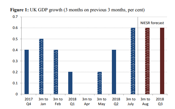 Согласно новых данных ONS, опубликованных сегодня утром, экономика Великобритании увеличилась на 0,6 процента за три месяца до июля по сравнению с предыдущими тремя месяцами после роста на 0,4 процента во втором квартале (за три месяца до июня). Результат был немного выше, чем 0,5-процентный месячный прогноз ВВП, который NIESR опубликовал в прошлом месяце за тот же период. Основываясь на официальных данных, ежемесячный прогноз ВВП от NIESR предполагает, что экономика настроена на поддержание 0,6-процентного роста в течение оставшейся части третьего квартала.