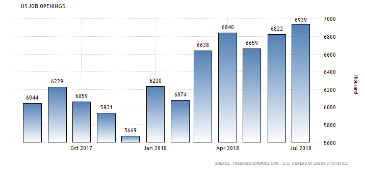 Обзор вакансий и текучести рабочей силы (JOLTS), опубликованный Бюро статистики труда США, показал, что в июле число вакансий выросло до нового рекордного максимума - до 6,939 млн. с 6,822 млн. в июне (пересмотрено с 6,662 млн.). Аналитики ожидали, что число вакансий снизится до 6,68 млн. Уровень вакансий составил 4,4 процента, не изменившись относительно июня. Количество вакансий мало изменилось как в частном секторе, так и в правительственной сфере. Что касается отраслей, количество вакансий увеличилось в области финансов и страхования (+46 000) и производства товаров кратковременного пользования (+32 000), но сократилось в розничной торговле (-85 000), сфере образовательных услуг (-34 000) и сегменте федерального правительства (-19 000).