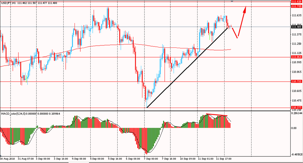 Сегодня утром пара USD/JPY упала к Y111.45, отступив от вчерашнего максимума. Во вторник пара, оттолкнувшись от линии поддержки от 7 сентября, выросла и закрыла день на положительной территории. Глобально USD/JPY остается выше линии скользящей средней MA 200 H1, однако, на данный момент тестирует на прочность поддержку 3-дневного ралли. К тому же на часовом графике сформировалась бычья дивергенция по индикатору MACD, что сигнализирует о возможном формирование глубокой коррекции или развороте цен.