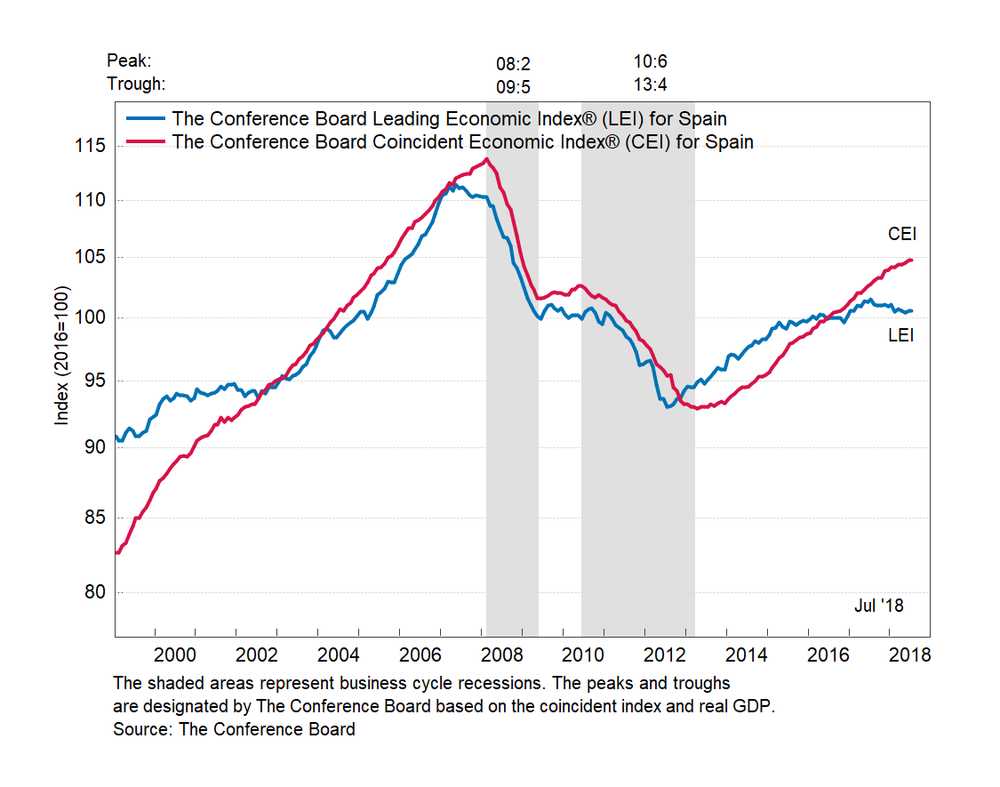 Результаты исследований, опубликованные Conference Board, показали: по итогам июля ведущий экономический индекс (LEI) для Испании не изменился, и составил 100,6 пункта (2016=100). Напомним, индекс зафиксировал повышение на 0,2 процента в июне и снижение на 0,2 процента в мае. В течение шести месяцев (с января 2018 года по июль 2018 года) показатель упал на 0,5 процента после снижения на 0,3 процента за предыдущий шестимесячный период (с декабря 2017 года по июнь 2018 года).