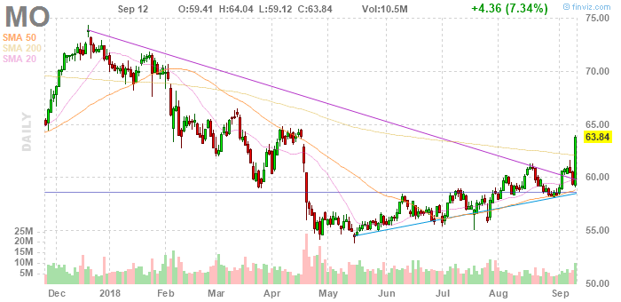 Акции Altria (MO) и British American Tobacco (BTI) выросли примерно на 7% - самый лучший день с ноября 2008 года. Акции Philip Morris International (PM) выросли почти на 5% - самый лучший день с апреля 2015 года.