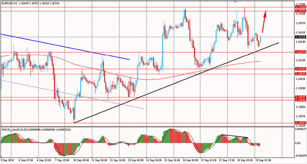 Пара EUR/USD сегодня утром торговалась в диапазоне $1.1655-80. Вчера пара, усиленная образованием медвежьей дивергенции на индикаторе MACD, начала снижаться и закрыла день в красной зоне. На данный момент, корректируясь, пара приблизилась к линии поддержки аптренда от 10 сентября. Однако, несмотря на откат, следует учитывать, что евро все еще находится в общем восходящем тренде, выше линии скользящей средней MA 200 H1. Пока данная ситуация сохраняется, логичным будет присматриваться к покупкам пары на окончание начатой вчера коррекции.