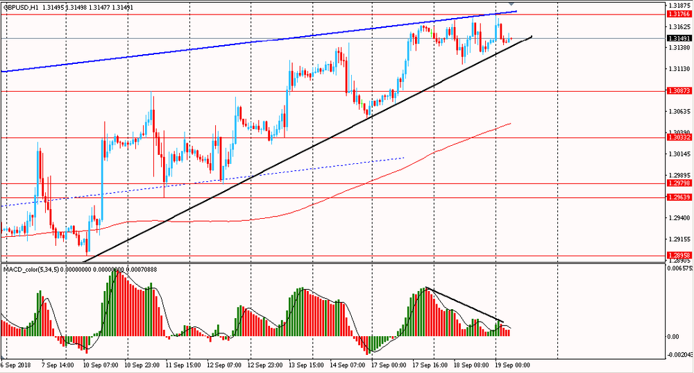 Пара GBP/USD сегодня утром торговалась в диапазоне $1.3140-75, оставаясь около недельных максимумов. Вчера пара, зажатая с двух сторон поддержкой и сопротивлением, также торговалась в боковом движении и закрыла день около цены открытия дня. На данный момент пара все еще находится в рамках общего восходящего тренда на 4-часовом графике, выше линии скользящей средней MA 200 H1. В данной ситуации логично присматриваться к новым покупкам на образовании коррекций. Однако, стоит отметить, что на часовом графике сформировалась медвежья дивергенция по индикатору MACD, что сигнализирует о возможном формирование глубокой коррекции или развороте цен.