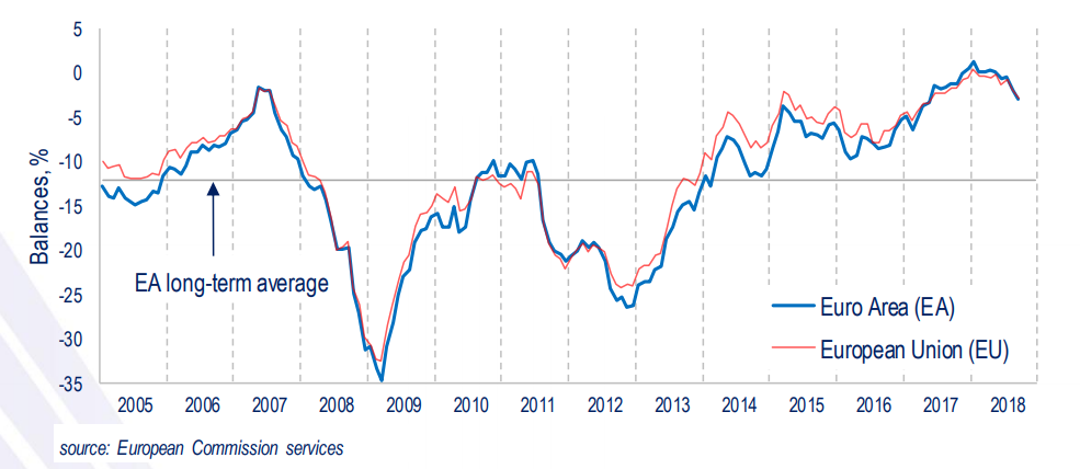Европейская комиссия заявила, что предварительный индекс уверенности потребителей снизился на 1 пункт, до -2,9 пункта. Экономисты ожидали снижения данного индекса лишь до -2,0 пункта.