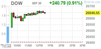 Большинство компонентов DOW в плюсе (29 из 30). Лидер роста - JPMorgan Chase & Co. (JPM, +2.51%). Аутсайдер - Chevron Corporation (CVX, -0.22%).