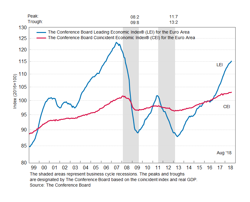 Результаты исследований, опубликованные Conference Board, показали: в августе ведущий экономический индекс (LEI) для еврозоны вырос на 0,4 процента, и составил 115,2 пункта (2016=100). Напомним, индекс зафиксировал повышение на 0,3 процента в июле и увеличение на 0,2 процента в июне. В течение шести месяцев (с февраля 2018 года по август 2018 года) показатель вырос на 2,6 процента после повышения на 2,8 процента за предыдущий шестимесячный период (с января 2018 года по июль 2018 года).