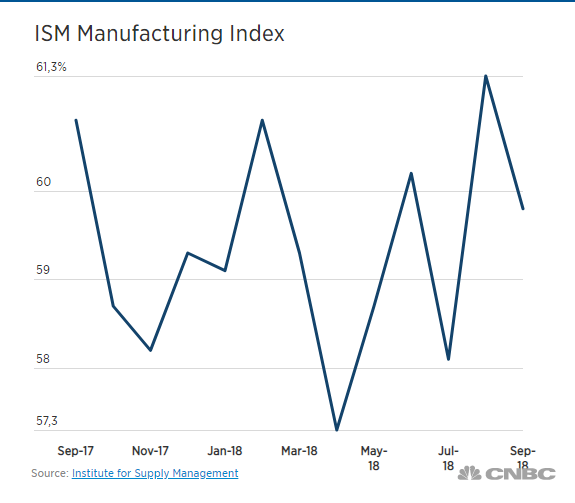 Индекс PMI для производственной сферы упал в сентябре до 59,8 пункта с 61,3 пункта в августе. Аналитики ожидали, что данный показатель упадет до 60,3 пункта. Напомним, показатель является результатом опроса около 400 фирм из 60 секторов по всем США, включая сельское хозяйство, добычу, строительство, транспортную сферу, связь, оптовые и розничные компании. Значение индекса ISM, превышающее 50, обычно рассматривается как показатель роста производственной активности, а меньшее 50, соответственно, падения.
