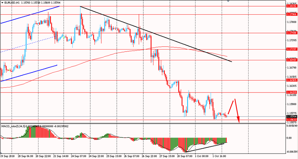 Пара EUR/USD сегодня утром торговалась в диапазоне $1.1565-80, оставаясь около вчерашних минимумов. В понедельник евро снижался и закрылся день на отрицательной территории. На данный момент пара находится в нисходящем тренде от 24 сентября и торгуется ниже линии скользящей средней MA 200 H1. Медведи полностью владеют ситуацией и пока евро будет находится ниже мувинга и линии сопротивления даунтренда, есть смысл присматриваться к новым продажам пары на коррекциях. Однако, стоит отметить, что на часовом графике сформировалась бычья дивергенция по индикатору MACD, что сигнализирует о возможном формирование глубокой коррекции или развороте цен.
