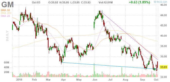 На текущий момент акции General Motors (GM) котируются по $33,93 (+1,89%)