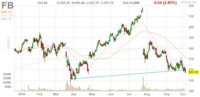 На текущий момент акции Facebook (FB) котируются по $157,79 (-2,85%)