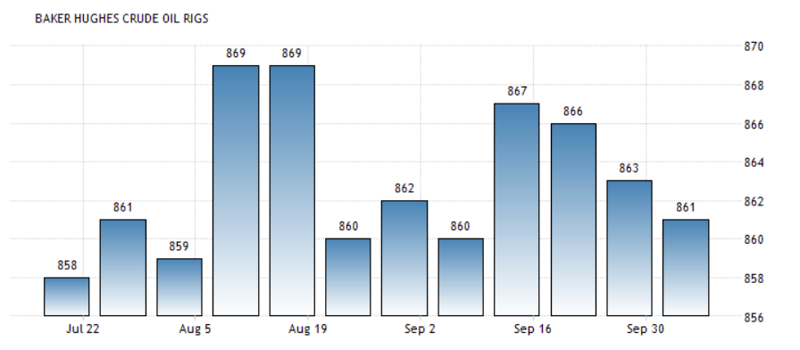 Отчет нефтесервисной компании Baker Hughes показал: с 29 сентября по 5 октября количество активных буровых установок по добыче нефти в США уменьшилось на 2 штуки, и составило 861 единицу. Напомним, годом ранее количество установок составляло 748 штук. Количество установок по добыче газа не изменилось, составив 189 единиц. Общее число буровых установок (газовых, нефтяных и прочих) упало на 2 штуки, и составило 1052 штуки.