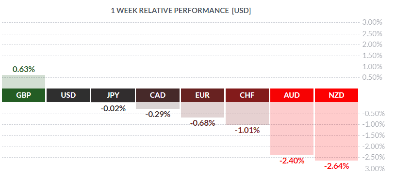 По итогам недели почти все основные валюты продемонстрировали снижение. Наибольший спад по отношению к доллару США показали новозеландский доллар (-2,64%) и австралийский доллар (-2,40%), Меньшее падение зафиксировали швейцарский франк (-1,01%), евро (-0,68%), канадский доллар (-0,29%) и японская иена (-0,02%). Подорожал только британский фунт (+0,63%).
