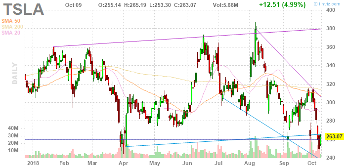На текущий момент акции Tesla (TSLA) котируются по $263,07 (+4,99%)