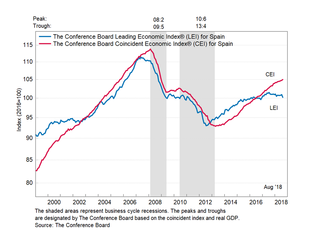 Результаты исследований, опубликованные Conference Board, показали: по итогам августа ведущий экономический индекс (LEI) для Испании упал на 0,7 процента, и составил 100,2 пункта (2016=100). Напомним, индекс зафиксировал повышением по 0,1 процента в июле и июне. В течение шести месяцев (с февраля 2018 года по август 2018 года) показатель упал на 0,3 процента после снижения на 0,2 процента за предыдущий шестимесячный период (с января 2018 года по июль 2018 года).