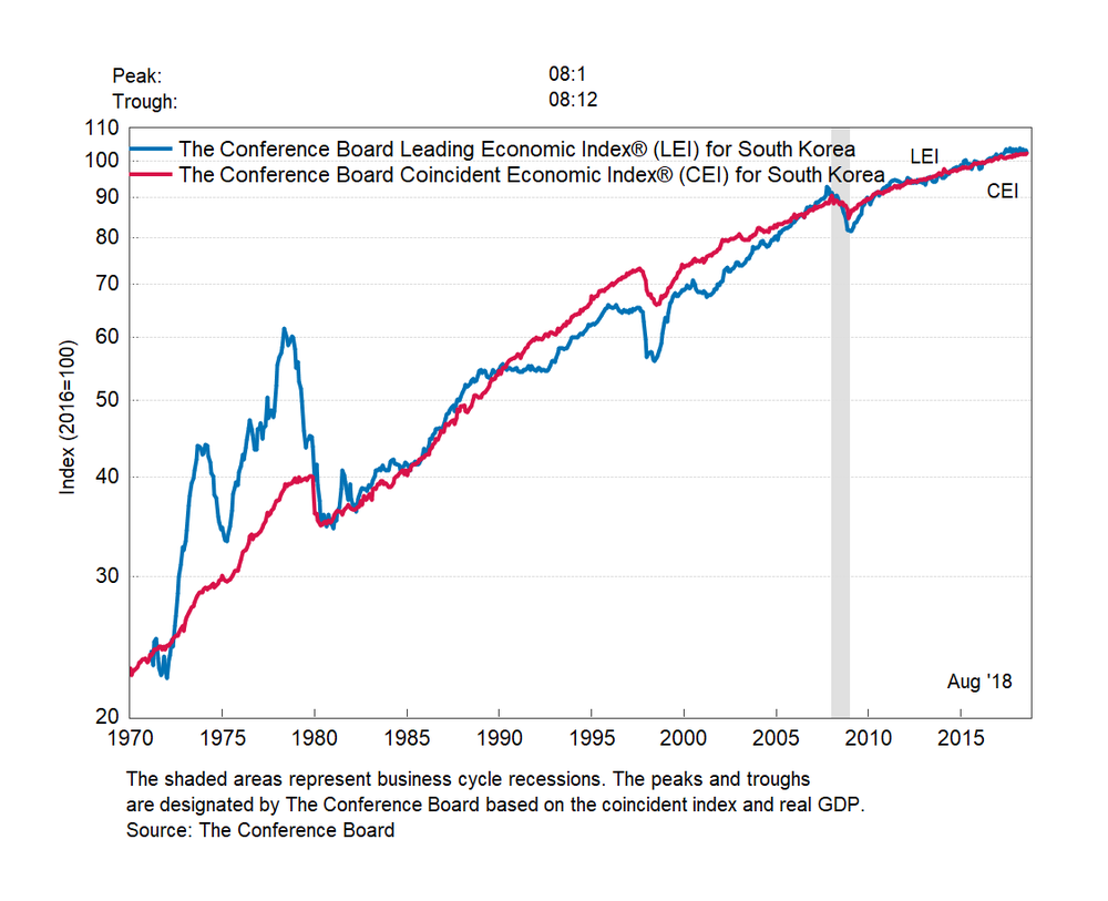Результаты исследований, опубликованные Conference Board, показали: по итогам августа ведущий экономический индекс (LEI) для Южной Кореи снизился на 0,4 процента, и составил 102,7 пункта (2016=100). Напомним, индекс зафиксировал повышением на 0,3 процента в июле и падение на 0,7 процента июне. В течение шести месяцев (с февраля 2018 года по август 2018 года) показатель вырос на 0,4 после снижения на 0,4 процента за предыдущий шестимесячный период (с января 2018 года по июль 2018 года).