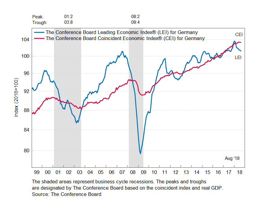 Результаты исследований, опубликованные Conference Board, показали: по итогам августа ведущий экономический индекс (LEI) для Германии упал на 0,2 процента, и составил 101,2 пункта (2016=100). Напомним, индекс зафиксировал снижение на 0,1 процента в июле и падение на 0,3 процента в июне. В течение шести месяцев (с февраля 2018 года по август 2018 года) показатель упал на 2,0 процента после снижения на 2,1 процента за предыдущий шестимесячный период (с января 2018 года по июль 2018 года).