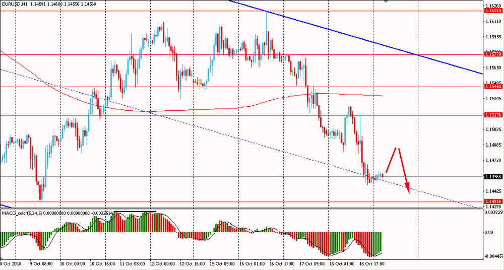 Пара EUR/USD сегодня утром торговалась в диапазоне $1.1450-60, оставаясь около вчерашнего минимума. В четверг пара весь день снижалась и закрыла день на отрицательной территории. Помимо этого, евро сумел окончательно закрепиться ниже линии скользящей средней MA 200 H1. В связи с этим можно сделать вывод, что медведи полностью владеют инициативой. В этом случае, пока пара находится ниже мувинга, лучше придерживаться южного направления, и на образование коррекции присматриваться к новым продажам евро против доллара, придерживаясь общего даунтренда на 4-х часовом графике от 24 сентября.