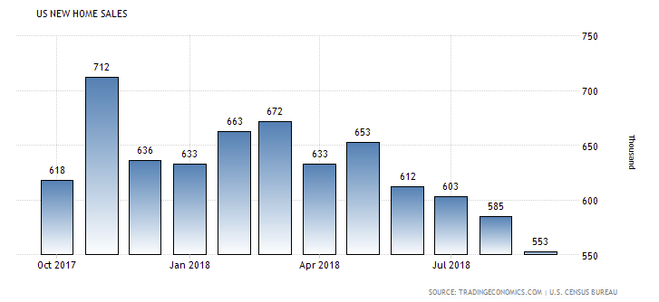 Министерство торговли сообщило, что продажи новых домов упали на 5,5% до сезонно скорректированного годового показателя в 553 000 единиц. Это был самый низкий уровень с декабря 2016 года. Темпы продаж в августе были пересмотрены до 585 000 единиц с 629 000 единиц. Данные за июль и июнь также были пересмотрены в сторону понижения. Стоит подчеркнуть, что продажи новых домов падают уже четыре месяца подряд. Экономисты прогнозировали, что в сентябре продажи новых домов, на которые приходится около 9,7% продаж на рынке жилья, упали до 625 000 единиц. Продажи новых домов берутся из разрешений и, как правило, изменчивы на ежемесячной основе. Данные показали, что в годовом выражении продажи нового жилья упали на 13,2%.