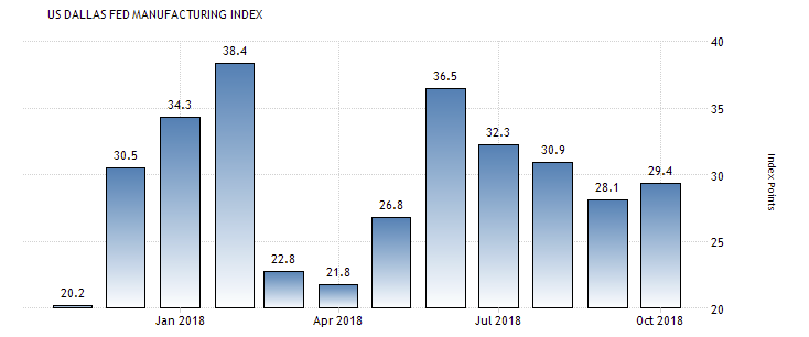 Согласно отчету, производственный индекс ФРБ Далласа в октябре вырос до 29,4 пункта с 28,1 пункта в сентябре. Аналитики ожидали снижение показателя до 25,1 пункта. Напомним, значение индекса выше нуля говорит о росте деловой активности. Экономисты воспринимают отчеты региональных федеральных резервных банков как предварительные данные перед публикацией ежемесячного отчета Института управления поставками (ISM). Отчет ФРБ Далласа является последним из пяти производственных опросов, проводимых региональными подразделениями ФРС