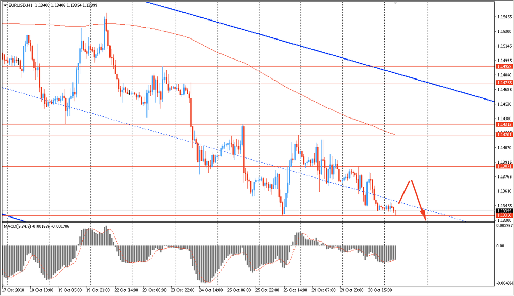 Пара EUR/USD торгуется в узком диапазоне $1.1335-50, оставаясь около вчерашнего минимума. Во вторник пара весь день снижалась и закрыла очередной день на отрицательной территории. На данный момент евро остается под давлением и торгуется в области срединной линии нисходящего канала от 16 октября. Помимо этого, единая валюта по прежнему находится ниже линии скользящей средней MA 200 H1. Медведи полностью владеют инициативой, поэтому лучше придерживаться южного направления, и на образование коррекции присматриваться к новым продажам евро против американского доллара.