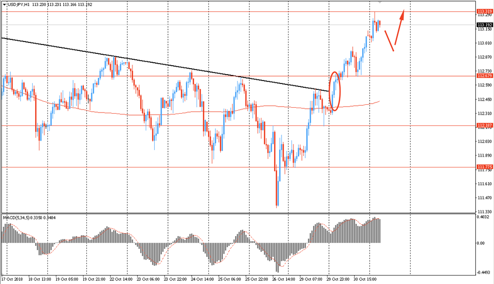 Сегодня утром пара USD/JPY резко выросла к Y113.30, продолжив вчерашний подъем. Во вторник пара также была на подъеме и сумела закрыть день на положительной территории. Помимо этого, USD/JPY смогла окончательно закрепиться выше линии скользящей средней MA 200 H1 и наклонной линии сопротивления предыдущего даунтренда. Таким образом быки удерживают инициативу и в этой ситуации, логичным будет присматриваться к покупкам пары на формирование коррекции.