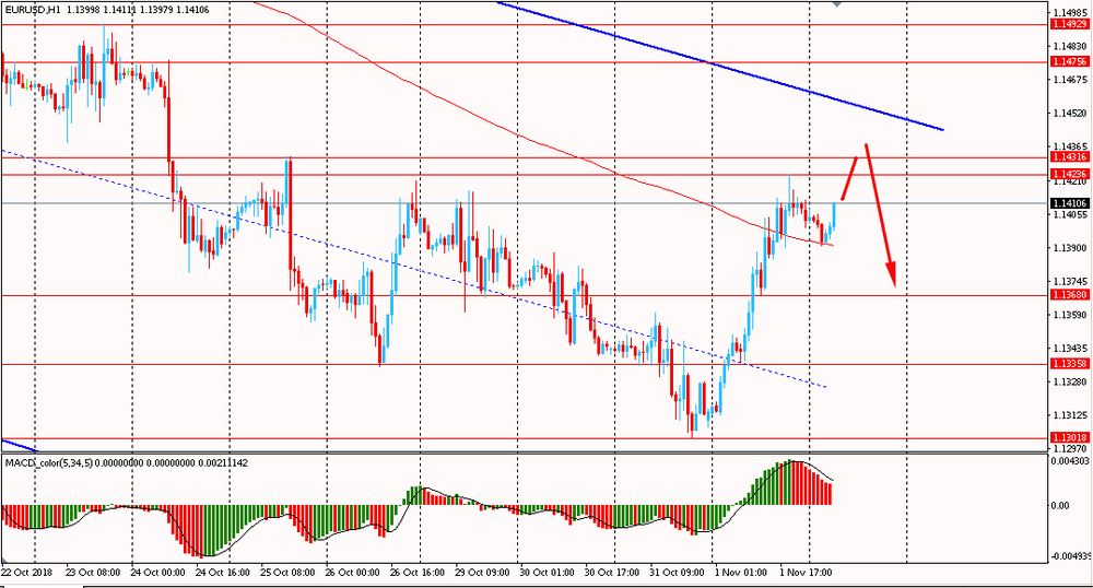Сегодня утром пара EUR/USD выросла к $1.1390-05, торгуясь около вчерашнего максимума. В четверг пара, оттолкнувшись от срединной линии нисходящего канала, выросла и закрыла день на положительной территории. На данный момент евро пытается закрепиться выше линии скользящей средней MA 200 H1. Таким образом пара EUR/USD продолжает корректироваться, но по-прежнему остается в рамках общего даунтренда от 16 октября. Медведи все еще полностью владеют инициативой, поэтому лучше придерживаться южного направления, и на окончание коррекции присматриваться к новым продажам евро против американского доллара.