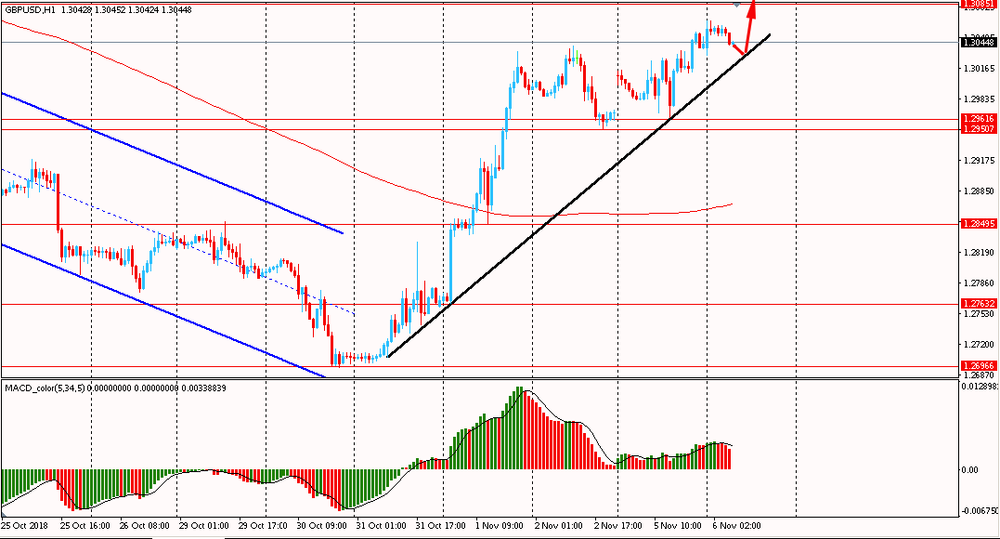 Пара GBP/USD сегодня утром торговалась в диапазоне $1.3035-65, оставаясь около вчерашнего максимума. В понедельник пара, оттолкнувшись от наклонной линии поддержки выросла и закрыла день на положительной территории. На данный момент фунт продолжает оставаться на подъеме, выше линии скользящей средней MA 200 H1. Быки удерживают ситуацию. Пока пара находится выше наклонной линии поддержки от 31 октября, лучше придерживаться северного направления и на коррекциях присматриваться к новым покупкам фунта против американского доллара.
