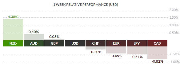 По итогам недели основные валюты продемонстрировали смешанную динамику. Прирост отношению к доллару США показали новозеландский доллар (+1,38%), австралийский доллар (+0,40%) и британский фунт (+0,08%). Падение зафиксировали канадский доллар (-0,82%), японская иена (-0,51%), евро (-0,45%) и швейцарский франк (-0,20%).