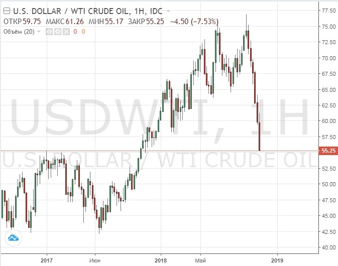 Обвал на рынке нефти набирает обороты: декабрьские фьючерсы на нефть WTI подешевели на 7,8%, и сейчас торгуются на $55.25 (самый низкий уровень с середины ноября 2017 года)