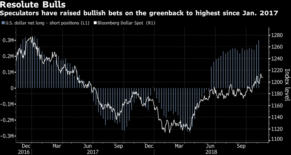 Эскалация напряженности в торговле, повышение доходности казначейских облигаций и устойчивая экономика США стимулировали спрос инвесторов на крупнейшую в мире резервную валюту. Индекс доллара США вырос на 8 процентов с середины апреля, поддержанный бычьими хедж-фондами, которые недавно подняли свои чистые длинные позиции по валюте до максимума с января 2017 года.