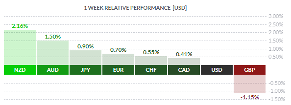 По итогам недели почти все основные валюты продемонстрировали повышение. Наибольший прирост по отношению к доллару США показал новозеландский доллар (+2,16%). Меньшее повышение зафиксировали австралийский доллар (+1,50%), японская иена (+0,90%), евро (+0,70%), швейцарский франк (+0,55%) и канадский доллар (+0,41%). Падение показал только британский фунт (-1,15%).