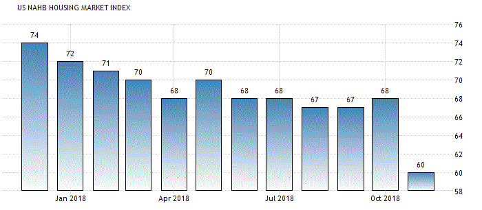Индекс состояния рынка жилья от Национальной ассоциации домостроителей (NAHB) и Wells Fargo снизился в ноябре на 8 пунктов, до 60 пунктов. Это самый низкий показатель с августа 2016 года. Впрочем, индекс остается выше отметки 50, что указывает на благоприятные перспективы продаж Напомним, индекс составил 69 пунктов в ноябре прошлого года и достиг циклического максимума 74 пункта в декабре прошлого года.