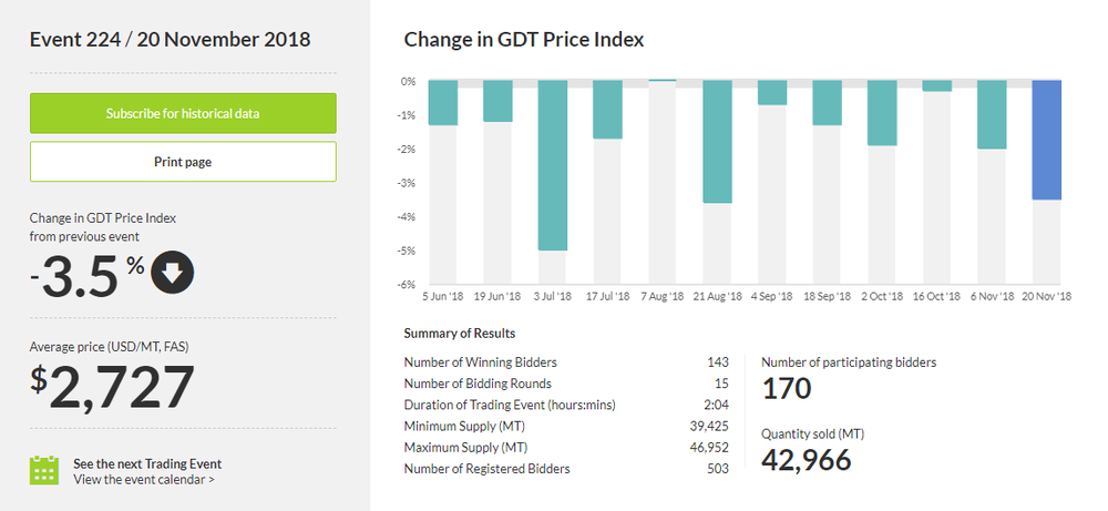 Как стало известно, стоимость молочной продукции снизилась на 3,5%, до $2 727 за метрическую тонну после того, как упала на 2,0% в ходе предыдущего аукциона. Результаты аукциона также показали, что стоимость цельного сухого молока упала на 1,8%, до $2 599 за метрическую тонну после снижения на 2,9% в ходе предыдущего аукциона. Тем временем, цена обезжиренного сухого молока уменьшилась на 1,6%, до $1 965 за метрическую тонну после того, как выросла на 1,2% в ходе предыдущего аукциона.