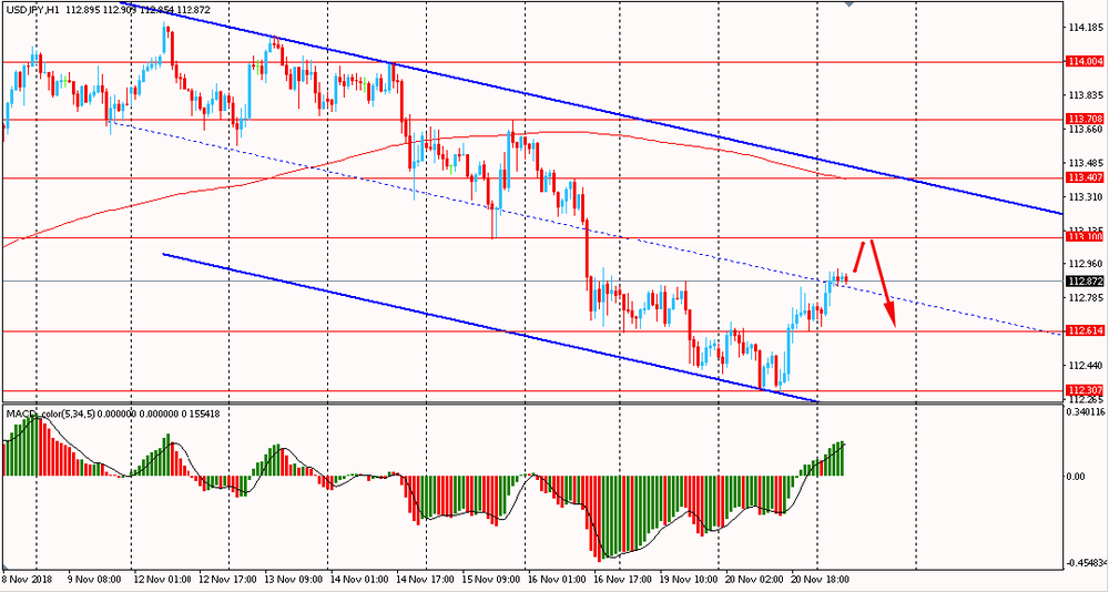 Сегодня утром пара USD/JPY выросла к Y112.90, продолжая вчерашний подъем. Во вторник пара, оттолкнувшись от линии поддержки наклонного канала, также выросла, и закрыла день на положительной территории. Таким образом пара пытается корректироваться и на данный момент уже торгуется около срединной линии даунтренда. Несмотря на откат, глобально медведи удерживают инициативу. Пока пара, будет находится ниже линии скользящей средней MA 200 H1, в рамках нисходящего тренда от 12 ноября, есть смысл искать новые продажи на окончание коррекционной структуры.
