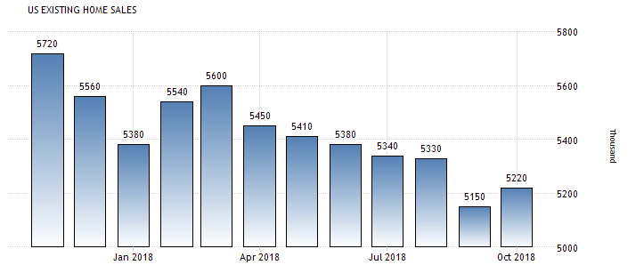 Национальная ассоциация риэлторов (NAR) заявила , что продажи жилья на вторичном рынке увеличились на 1,4%, до сезонно скорректированного годового показателя в 5,22 млн. единиц. Хотя последнее значение было немного выше, чем в сентябре (5,15 млн. единиц), объем продаж остался на 5,1% ниже, чем в октябре 2017 года, что является самым резким 12-месячным снижением с июля 2014 года. Экономисты ожидали, что в октябре продажи жилья вырастут до 5,2 млн. единиц.