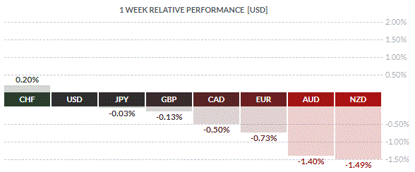 По итогам недели почти все основные валюты продемонстрировали снижение. Наибольший спад по отношению к доллару США показали новозеландский доллар (-1,49%) и австралийский доллар (-1,40%). Меньшее падение зафиксировали евро (-0,73%), канадский доллар (-0,50%), британский фунт (-0,13%) и японская иена (-0,03%). Повышение показал только швейцарский франк (+0,20%).