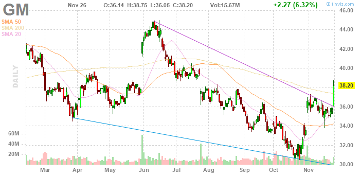 На текущий момент акции General Motors (GM) котируются по $38.20 (+6,32%).