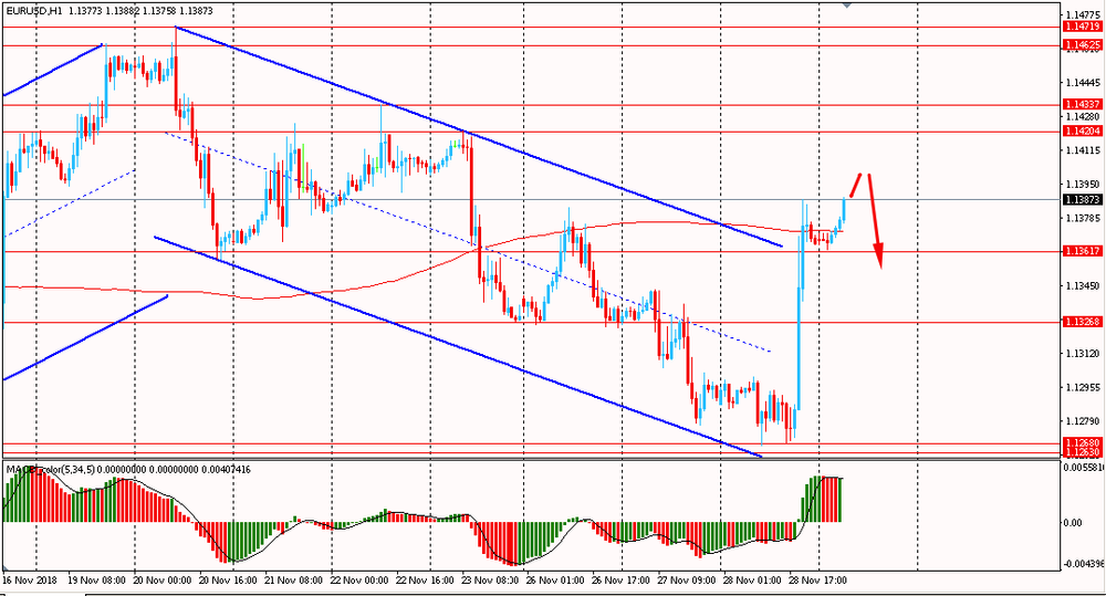Сегодня утром пара EUR/USD выросла к $1.1385, продолжая вчерашний подъем. В среду пара, оттолкнувшись от линии поддержки нисходящего канала, выросла и закрыла день на положительной территории. Таким образом, EUR/USD стремительно корректируется и на данный момент тестирует на прочность линию скользящей средней MA 200 H1 и наклонное сопротивление даунтренда от 20 ноября. Пока евро не смог закрепиться выше мувинга, медведи все еще удерживают общую ситуацию.