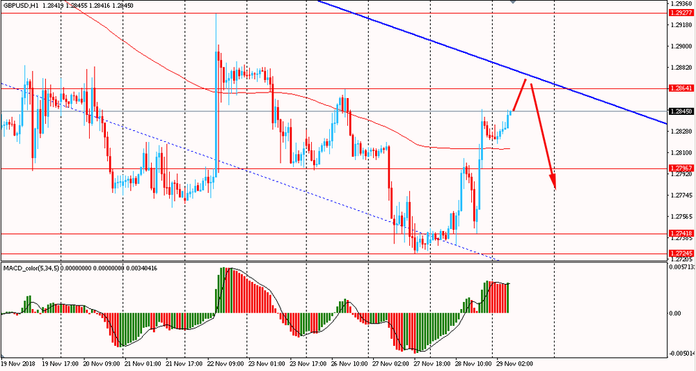 Пара GBP/USD сегодня утром выросла к $1.2845, продолжая вчерашний подъем. В среду пара, оттолкнувшись от срединной линии нисходящего канала, резко выросла и закрыла день на положительной территории. Помимо этого, GBP/USD удалось пробить линию скользящей средней MA 200 H1. На данный момент пара пытается закрепиться выше данного мувинга и развить коррекцию. Однако, несмотря на откат, фунт продолжает оставаться в рамках общего даунтренда. В связи с этим лучше придерживаться южного направления и на окончание коррекции открывать новые продажи фунта против американского доллара.