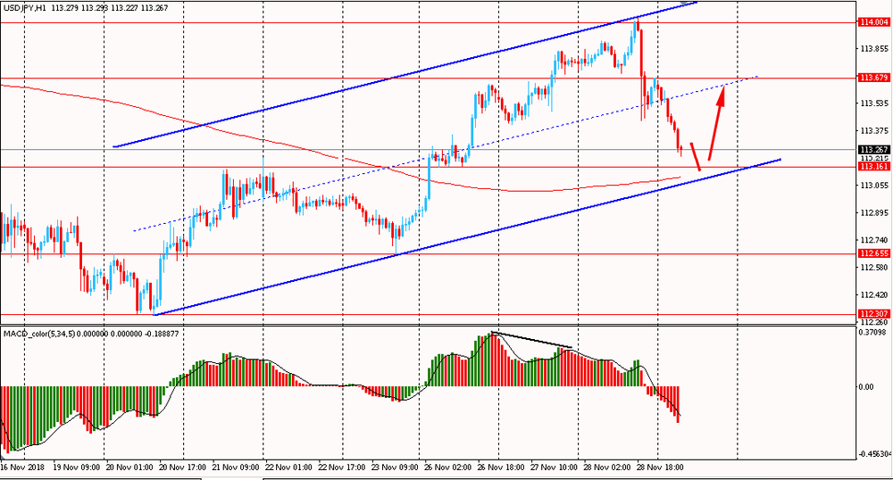 Сегодня утром пара USD/JPY упала к Y113.25, продолжая вчерашнее снижение. В среду пара, оттолкнувшись от линии сопротивления, резко упала и закрыла день на отрицательной территории. На текущий момент пара, усиленная образование медвежьей дивергенции развивает коррекцию. Однако, несмотря на откат, USD/JPY остается выше линии скользящей средней MA 200 H1, в рамках общего восходящего тренда от 20 ноября. Пока пара, торгуется выше мувинга и наклонной линии поддержки аптренда, есть смысл искать новые покупки на окончание коррекционной структуры.