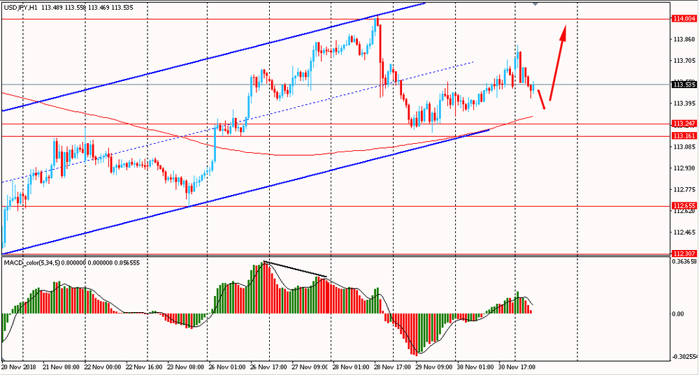 Сегодня утром пара USD/JPY торговалась в диапазоне Y113.45-80, оставаясь около пятничного максимума. В последний день прошлой торговой недели пара, оттолкнувшись от линии поддержки канала, выросла и закрыла день на положительной территории. На текущий момент пара, пытается сформировать новый восходящий импульс. USD/JPY остается выше линии скользящей средней MA 200 H1, в рамках общего восходящего тренда от 20 ноября. Пока пара, торгуется выше мувинга и наклонной линии поддержки аптренда, есть смысл искать новые покупки на формирование коррекционной структуры.