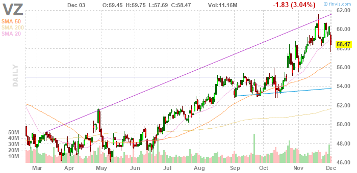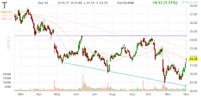 На текущий момент акции AT&T (Т) котируются по $31.78 (+1,71%), а Verizon (VZ) - по $58.47 (-3,04%)