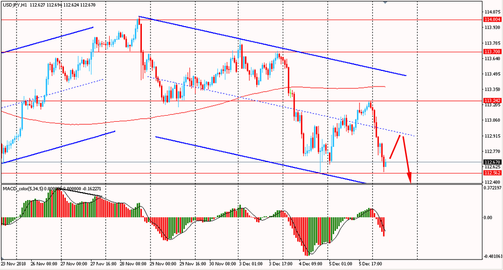 Сегодня утром пара USD/JPY упала к Y112.65. В среду пара, оттолкнувшись от линии поддержки общего нисходящего канала, выросла и закрыла день на положительной территории. Однако, на данный момент весь вчерашний подъем уже нивелирован и медведи полностью завладели инициативой: пара торгуется в даунтренде от 28 ноября, ниже линии скользящей средней MA 200 H1. Пока USD/JPY, торгуется ниже мувинга и наклонной линии сопротивления, есть смысл искать новые продажи на формирование коррекционной структуры.