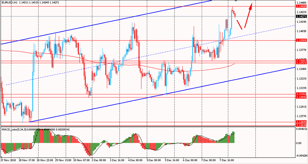 Сегодня утром пара EUR/USD выросла к $1.1440, продолжая пятничный подъем. В последний день прошлой торговой недели пара также выросла и закрыла день на положительной территории. Помимо этого, евро удалось закрепиться выше срединной линии восходящего канала. Таким образом EUR/USD сохраняет бычью направленность: находится выше линии скользящей средней MA 200 H1 в рамках общего аптренда от 28 ноября. В такой ситуации лучшим решением будет и далее присматриваться к покупкам пары на формирование коррекций.