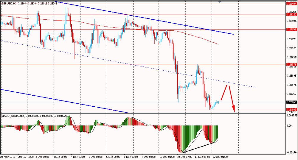 Пара GBP/USD сегодня утром торговалась в диапазоне $1.2480-15, оставаясь около вчерашнего минимума. Во вторник пара, оттолкнувшись от срединной линии нисходящего канала, упала и закрыла очередной день в красной зоне. Таким образом GBP/USD продолжает развивать нисходящий импульс, продолжая оставаться под давлением, ниже линии скользящей средней MA 200 H1 в рамках общего даунтренда от 7 ноября. В данной ситуации лучше и далее придерживаться южного направления в торговле и на формирование коррекции открывать новые продажи фунта против американского доллара. Однако, стоит отметить, что на часовом графике сформировалась бычья дивергенция по индикатору MACD, что сигнализирует о возможном формирование глубокой коррекции или развороте цен.