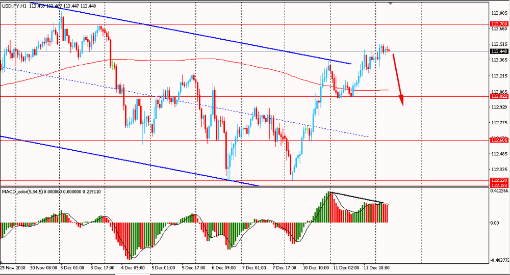Сегодня утром пара USD/JPY торговалась в диапазоне Y113.30-50, оставаясь около вчерашнего максимума. Во вторник пара выросла и закрыла день на положительной территории. Таким образом, на текущий момент пара продолжает развивать коррекцию к общему нисходящему движению. USD/JPY уже смогла пробить линию скользящей средней и наклонный уровень сопротивления глобального даунтренда. Однако, стоит отметить, что на часовом графике сформировалась медвежья дивергенция по индикатору MACD, что сигнализирует о возможном формирование глубокой коррекции или развороте цен. Это может вернуть цену ниже мувинга и доминирование медведей.